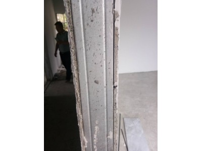 3、预埋钢板的背面墙皮开槽、铲掉(找平层),边框背面的墙皮同样铲掉,目的是让承重实墙紧密连接边框,防止坠移,更有效的受力。
